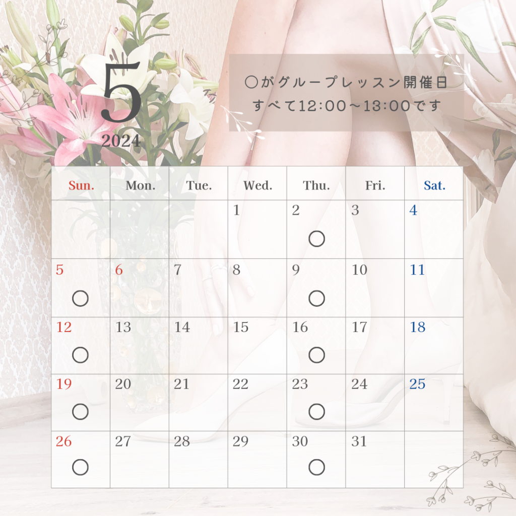 2024年5月のグループレッスン日程 Lesson Schedule 2024.05.14 5月はすべての木曜・日曜にグループレッスンを開催致します。 詳細確認&初回のご予約はこちらから!(外部サイトに移動します)